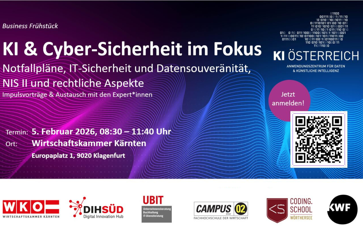In einzelnen Impulsvorträgen wird auf Notfallpläne für Cyber-Angriffe, Zero Trust im Microsoft-365-Umfeld sowie NIS 2 eingegangen. Zudem beantworten Expertinnen & Experten der Wirtschaftskammer Kärnten, des DIH SÜD sowie des KWF Ihre offenen Fragen. Von Seiten des KWF berät Sie Cornelia Jann zu unseren Förderungsprodukten.
