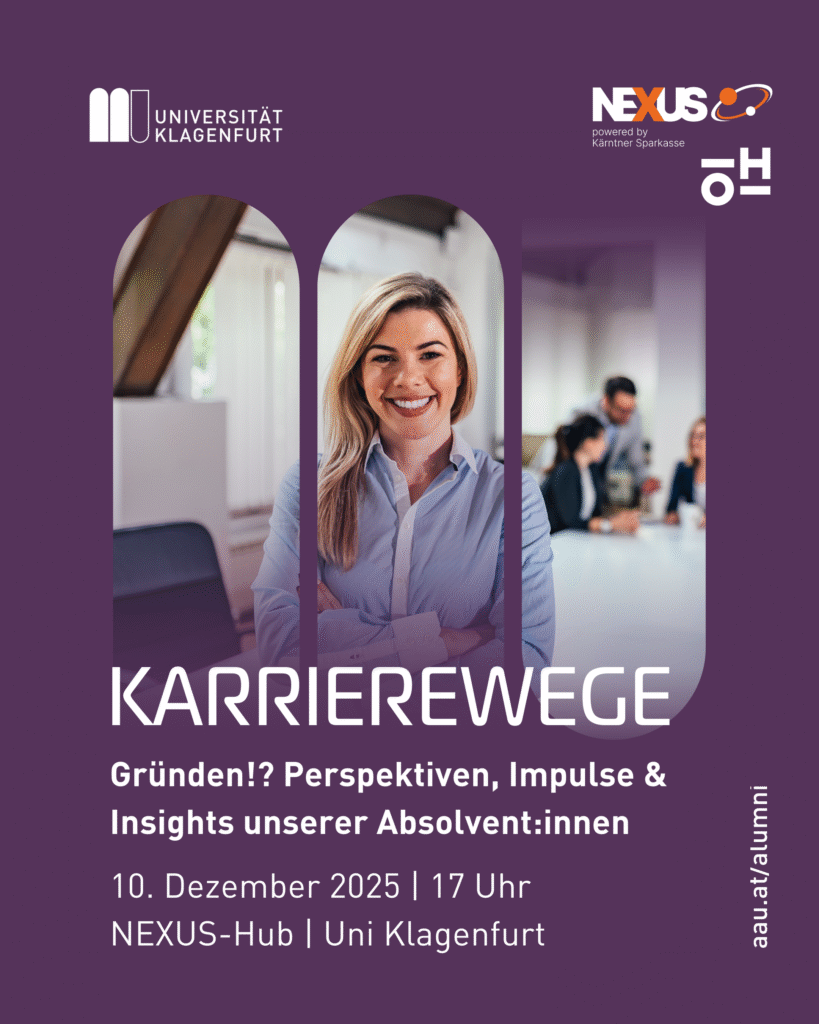 Die Veranstaltung – speziell für Absolventinnen und Absolventen der Alpen Adria Universität Klagenfurt – widmet sich diesmal dem Thema »Gründen?! Perspektiven, Impulse & Insights« und beleuchtet verschiedene Wege in die Selbstständigkeit.