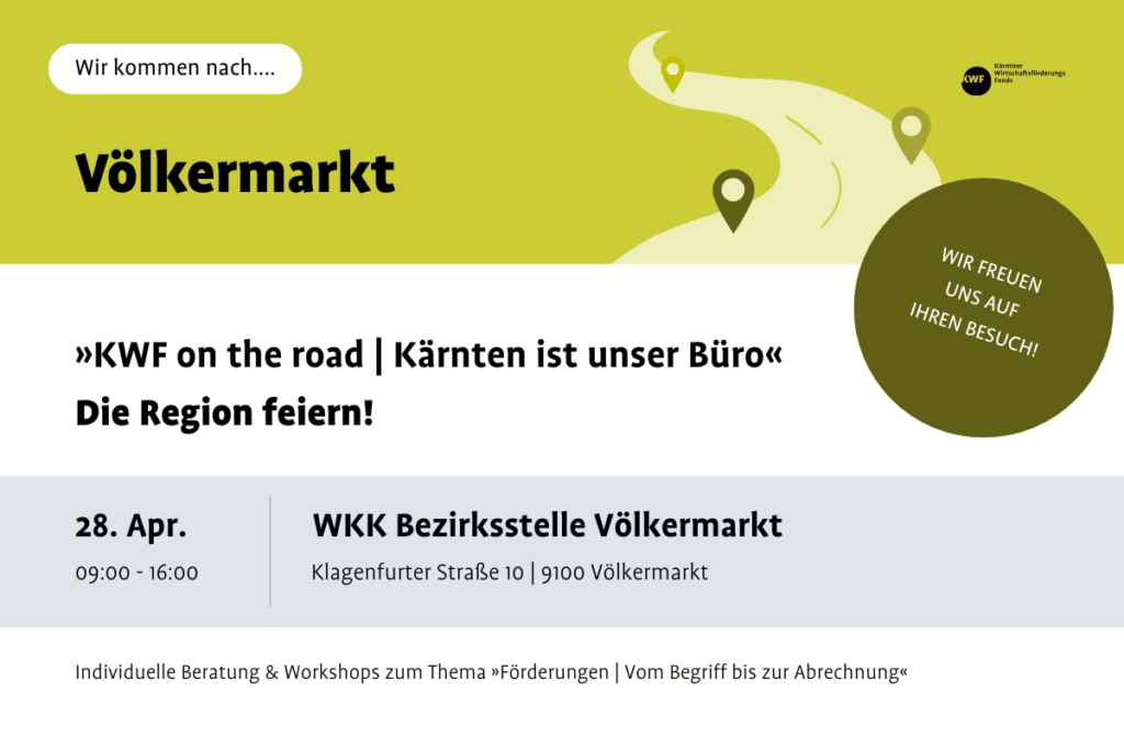 Wir beraten Sie im Zuge unserer Initiative »KWF on the road | Kärnten ist unser Büro« persönlich und individuell & geben Ihnen spezifische Hilfestellungen beispielsweise bei allgemeinen Fragen rund um das Thema Förderungen. Wir besprechen Ihr mögliches Förderungsvorhaben im Detail, vereinbaren einen Nachfolgetermin in Ihrem Unternehmen und zeigen Ihnen auch Möglichkeiten bei anderen Förderungsinstitutionen auf.