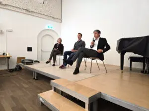 Ausschnitt des Kamingesprächs - drei Personen auf einer Bühne.